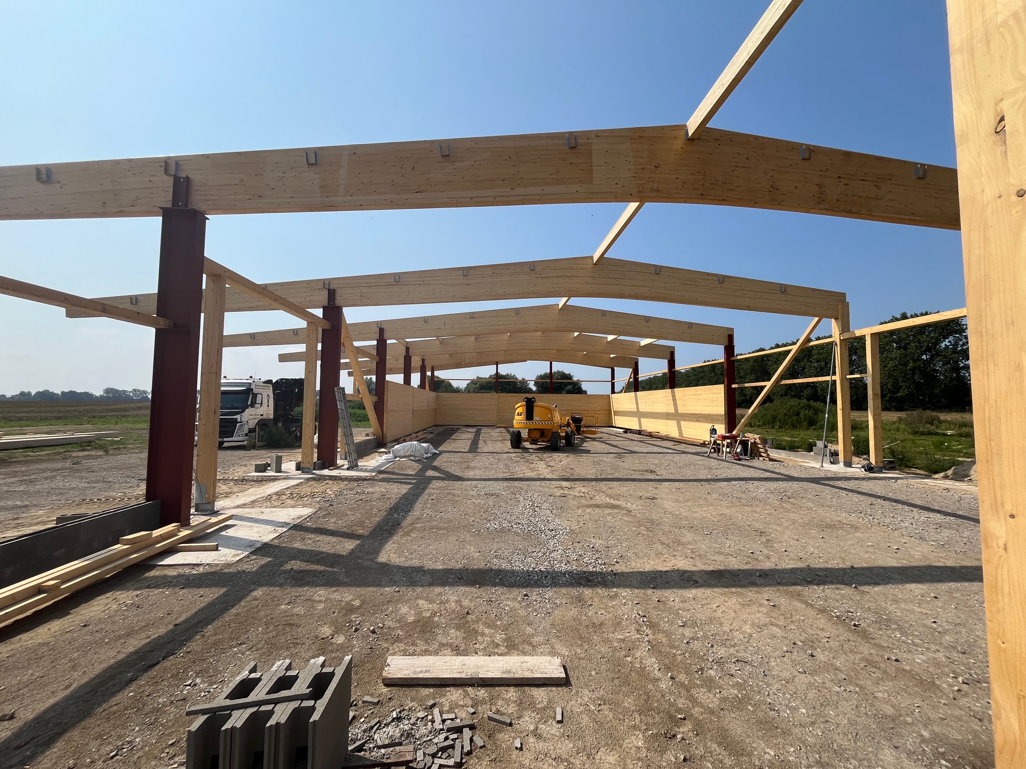 Die Halle hat eine Größe von 40m x 18m, Firsthöhe von 7m und einer ca. 310m² großen Freiflächenüberdachung. Zur besseren Befahrbarkeit der Halle wurden am Giebel und der Hallenseite Rolltore geplant. Auf Grundlage der Statikvorgaben wird die Hallenkonstruktion mit Stahlträgern und Holzbindern gebaut und mit gedämmten Trapezblechen verkleidet.