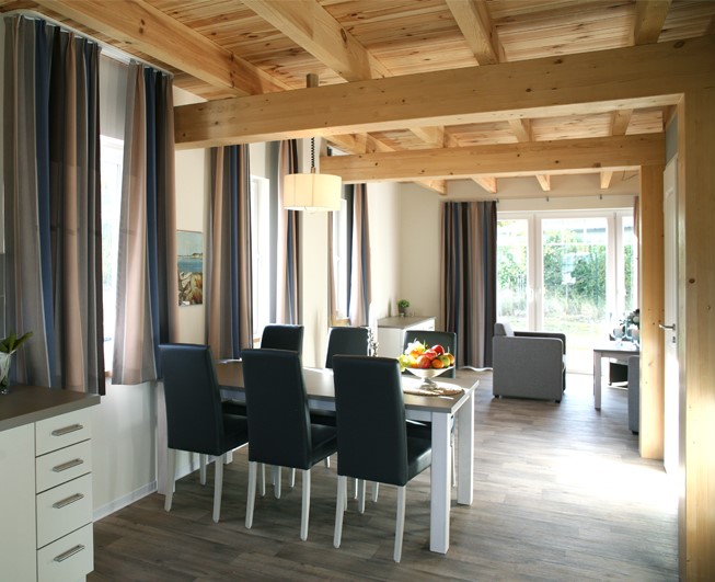 Die Dünenhäuser, in charmant nordischen Stil, laden seine Gäste zum Entspannen ein. Das Raumkonzept wurde auf die Urlaubsbedürfnisse seiner Gäste konzipiert und lädt zum Verweilen ein. Die zweistöckigen Häuser haben eine eigene Terrasse und schon beim Betreten des Dünenhauses strahlt die natürliche Holzdecke und schafft eine wohlige Atmosphäre. Der großzügige Raum im Erdgeschoss vereint den Wohn-, Ess- und Kochbereich und man gelangt direkt auf die Außenterrasse.