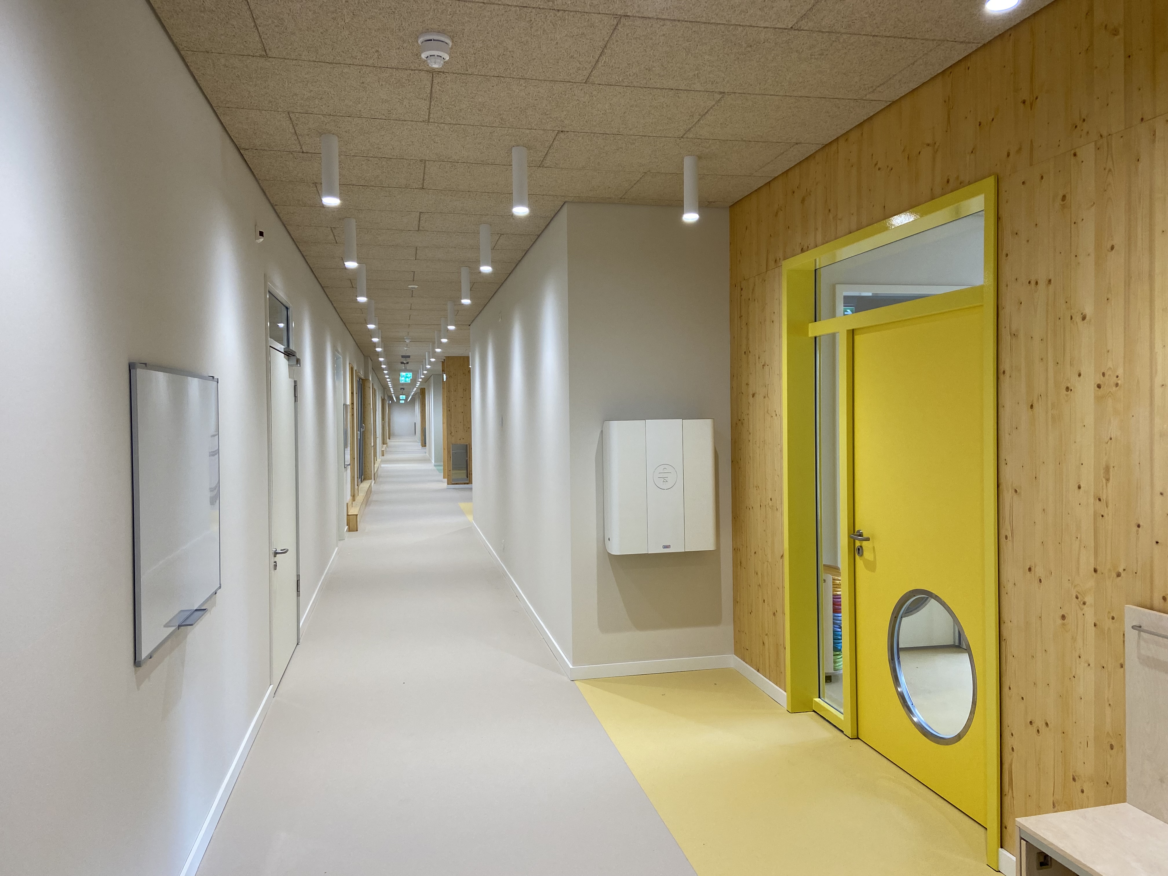 Ein 70m langer Spielflur, eine u.a. für Elterngespräche geeignete Cafeteria im Eingangsbereich, Therapieräume, die auch die Umsetzung der Inklusionspädagogik möglich machen, runden das Konzept ab.