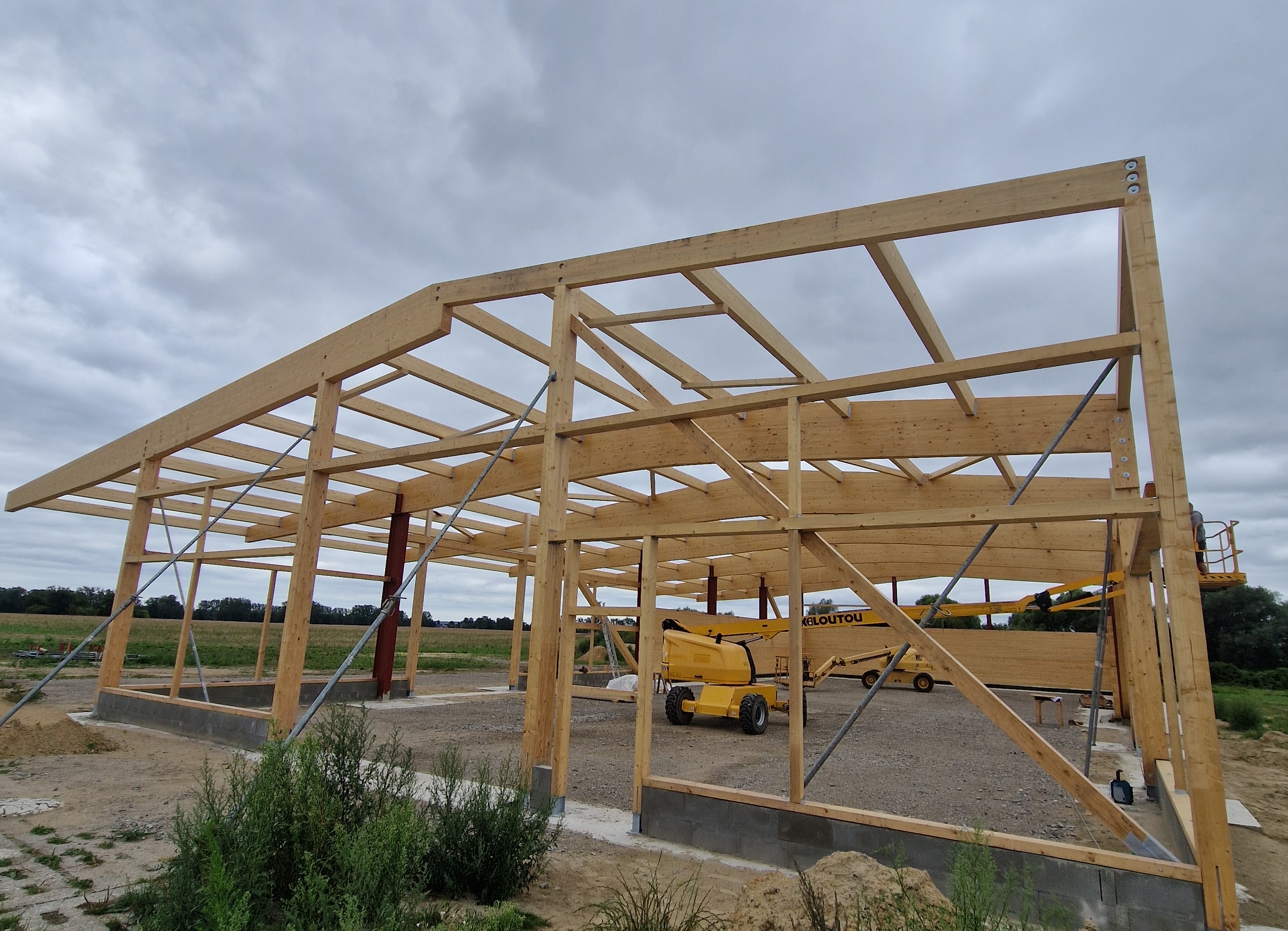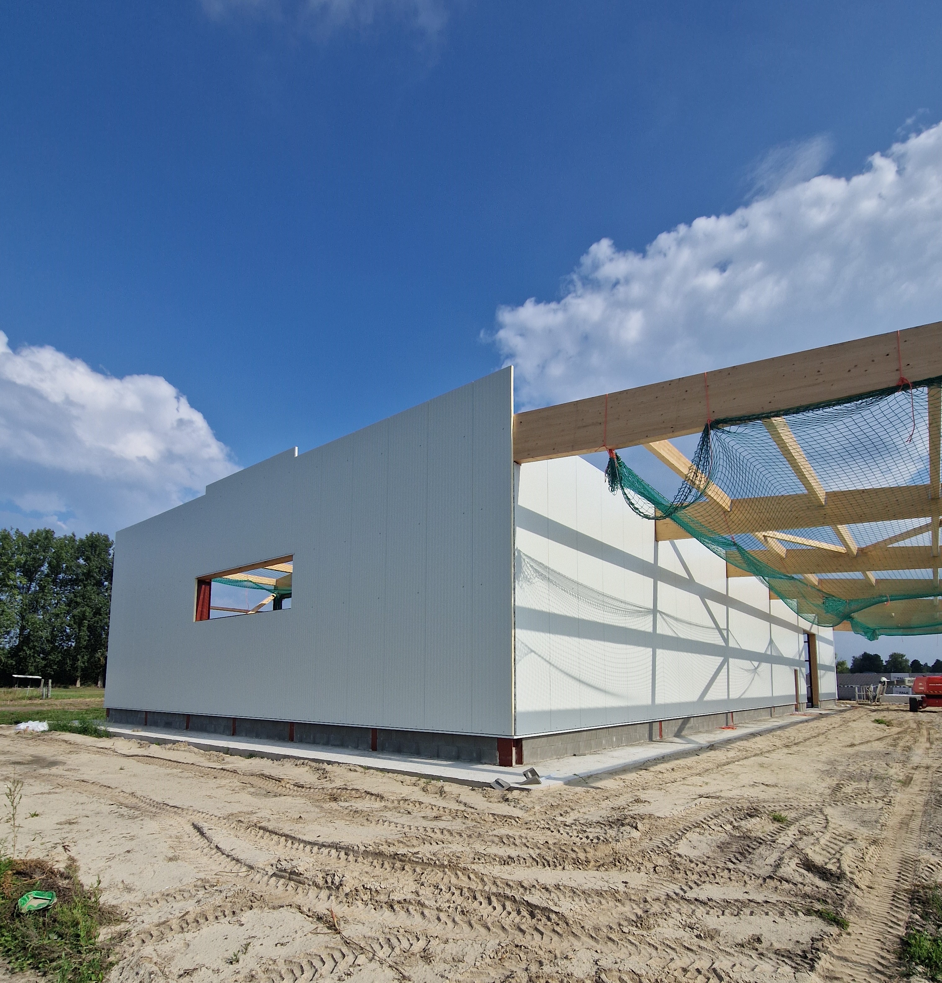 Die Halle hat eine Größe von 40m x 18m, Firsthöhe von 7m und einer ca. 310m² großen Freiflächenüberdachung. Zur besseren Befahrbarkeit der Halle wurden am Giebel und der Hallenseite Rolltore geplant. Auf Grundlage der Statikvorgaben wird die Hallenkonstruktion mit Stahlträgern und Holzbindern gebaut und mit gedämmten Trapezblechen verkleidet.