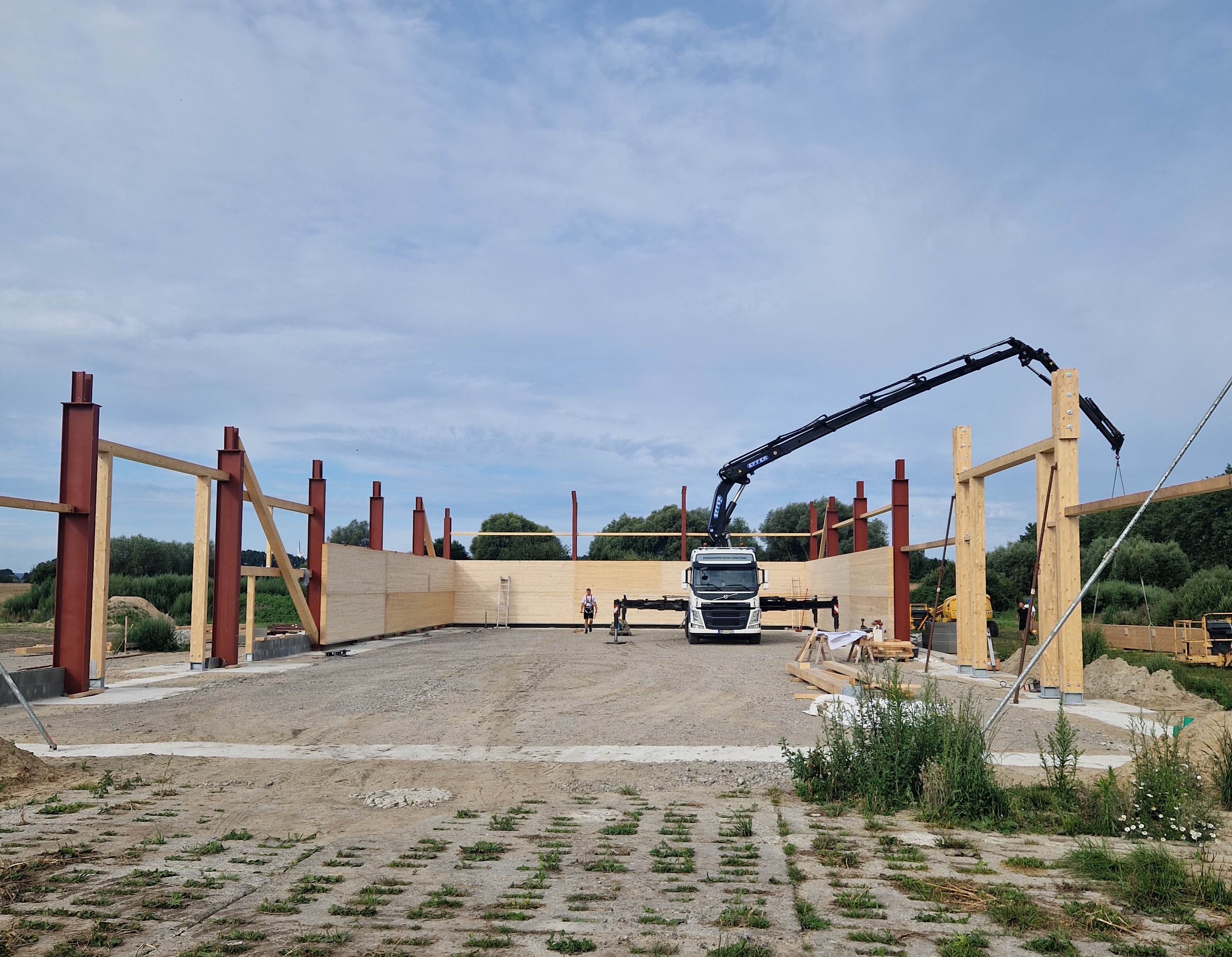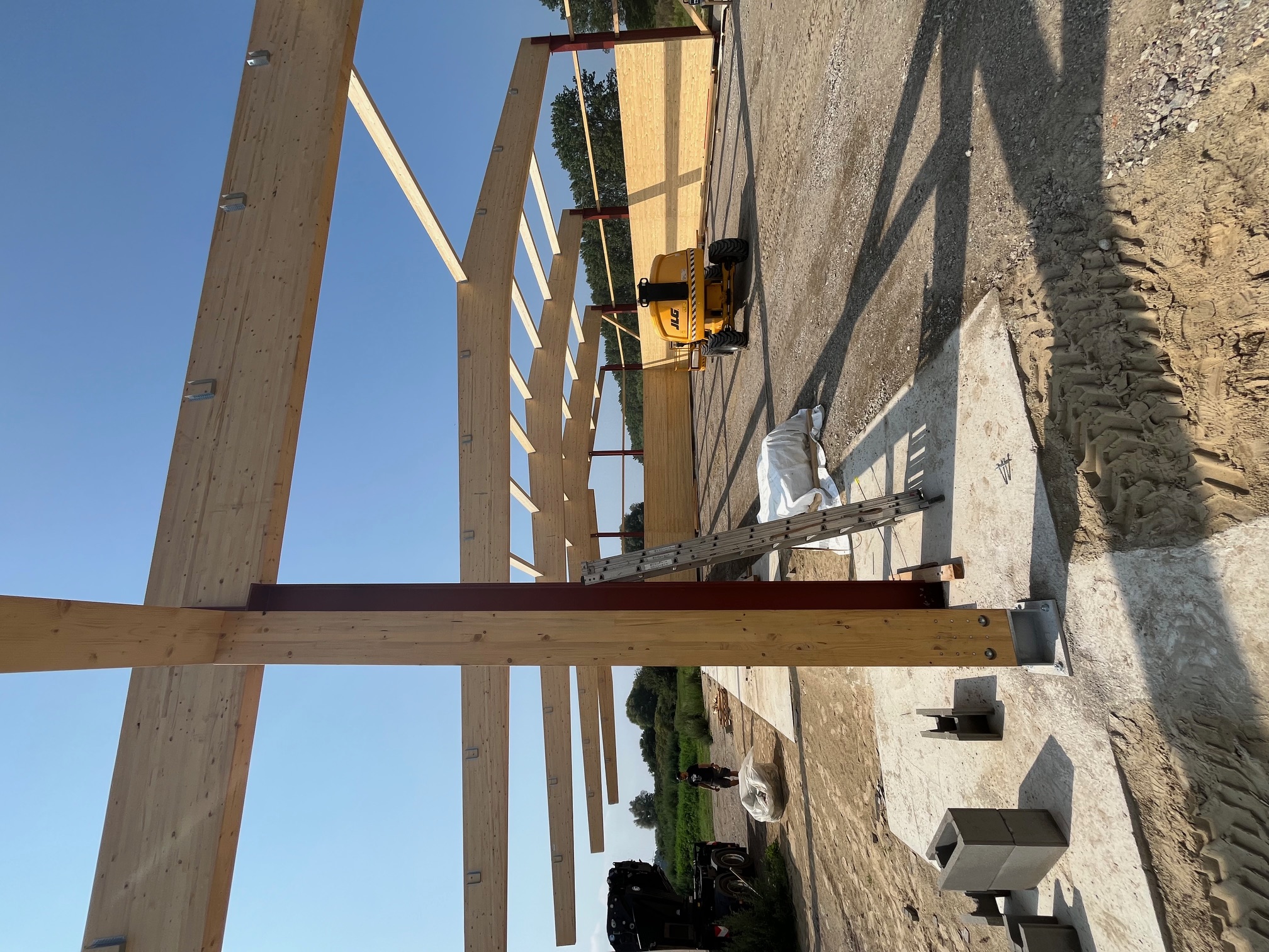 Die Halle hat eine Größe von 40m x 18m, Firsthöhe von 7m und einer ca. 310m² großen Freiflächenüberdachung. Zur besseren Befahrbarkeit der Halle wurden am Giebel und der Hallenseite Rolltore geplant. Auf Grundlage der Statikvorgaben wird die Hallenkonstruktion mit Stahlträgern und Holzbindern gebaut und mit gedämmten Trapezblechen verkleidet.